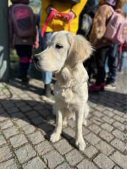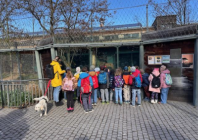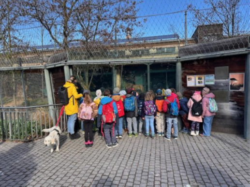 In Zweierreihen ging es zur Bushaltestelle, weiter über das Steintor und schließlich mit der Straßenbahn zum Zoo. Dort angekommen wartete direkt eine besondere Überraschung: Der freundliche Golden Retriever Luna begleitete die Klasse ein Stück durch den Zoo und sorgte für viele strahlende Gesichter.